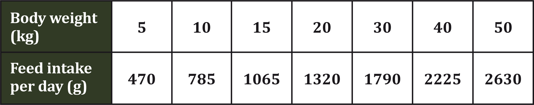 These instructions are a guideline only. An individual dog's requirements may differ from this guide according to e.g. age, body condition and activity levels. Feed 1 -2 meals per day. Initially feed daily amounts indicated in the table and then gradually adjust to maintain your dog in a lean condition. When introducing your dog to a new food, make the change gradually over 7-10 days, increasing the proportion of the new food each day. Fresh drinking water should always be available.