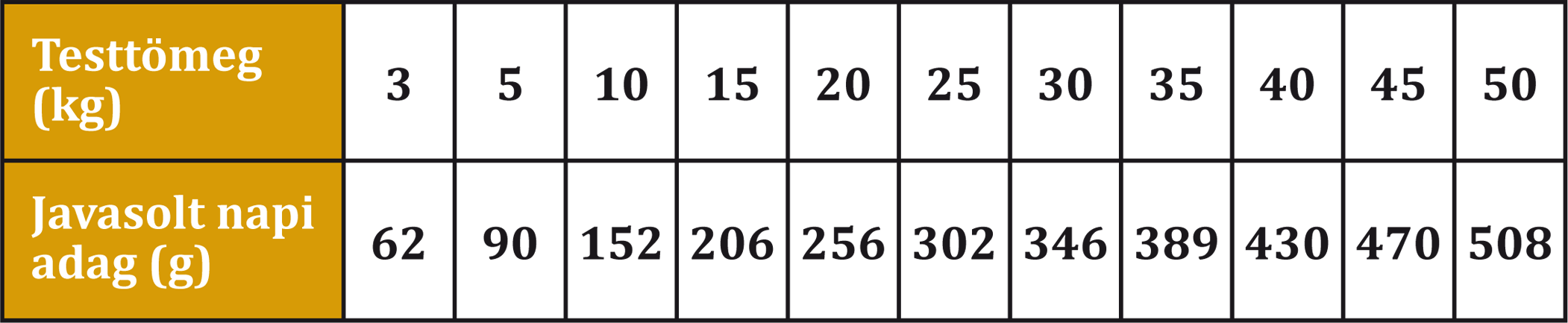 Ez az útmutató csupán tájékoztató jellegű. Kutyája egyéni szükségletei életkortól, fajtától, fizikai állapottól és aktivitástól függően változhatnak. Ideális esetben a napi tápmennyiséget ossza el 1–2 adagra. Kezdetben a táblázatban megadott mennyiségeknek megfelelően adagolja az eledelt, majd az elhízás elkerülése érdekében az adagokat fokozatosan igazítsa kutyája igényeihez. Ha új eledelre vált, a változtatásokat 7–10 nap alatt fokozatosan vezesse be, naponta kissé növelve az új eledel arányát. Kutyájának mindig biztosítson friss ivóvizet.