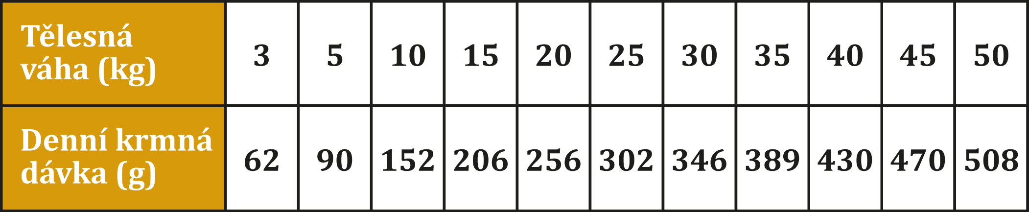 Tento návod je pouze orientační. Individuální potřeby vašeho psa se mohou lišit v závislosti na věku, plemenu, tělesné stavbě a aktivitě. Krmnou dávku ideálně rozdělte do 1 – 2 dávek. Při přechodu na nové krmivo provádějte změny postupně po dobu 7 – 10 dnů, postupně zvyšujte podíl nového krmiva každý den. Pes musí mít vždy k dispozici dostatek čerstvé pitné vody.