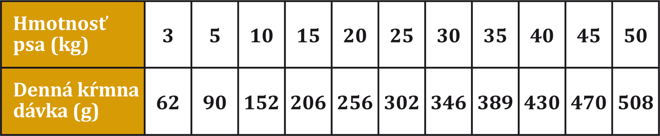 Tento návod je iba orientačný. Individuálna spotreba vášho psa závisí od jeho telesnej váhy, plemena, aktivity a veku. Podávajte ideálne 1-2 krát denne. Spočiatku podávajte krmivo podľa množstva uvedeného v tabuľke a potom postupne upravte kŕmnu dávku tak, aby ste udržali svojho psa v štíhlej kondícii. Pri prechode na nové krmivo robte zmenu postupne počas 7-10 dní, pričom každý deň zvyšujte podiel nového krmiva. Čerstvá pitná voda by mala byť vždy k dispozícii.